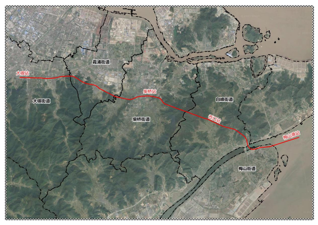 该线路起点位于宁波枢纽既有北仑支线的大碶站,经柴桥站、岙口站,终点位于梅山港站。全线按满足开行双层(高)集装箱列车要求设计,预留远期规划六横佛渡铁路接口条件。
