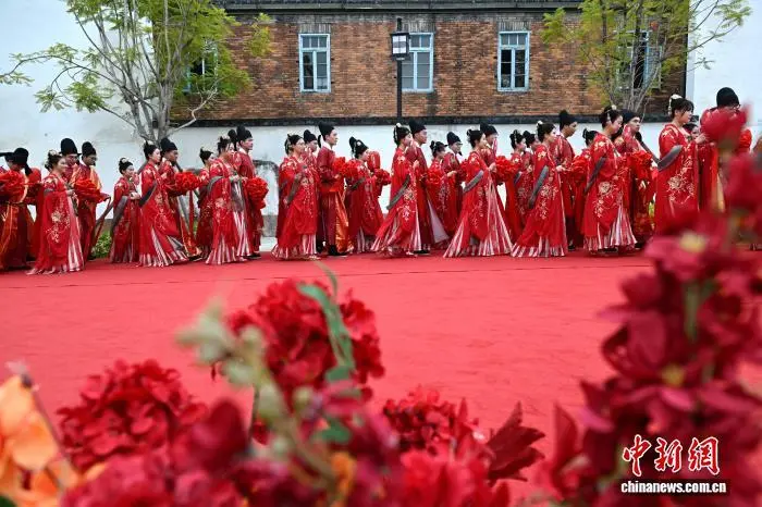 图为身穿福州三条簪装束的女子为新人们击鼓。中新社记者 吕明 摄