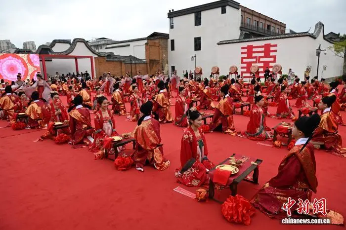 10月28日,2025年“有福之州 温暖榕城”集体婚礼在福建福州举行。百对新人身着唐制华服,依循传统仪轨举行唐制婚礼,在现场来宾的祝福声中,开启幸福生活的崭新篇章。图为合卺礼交杯共饮。中新社记者 吕明 摄