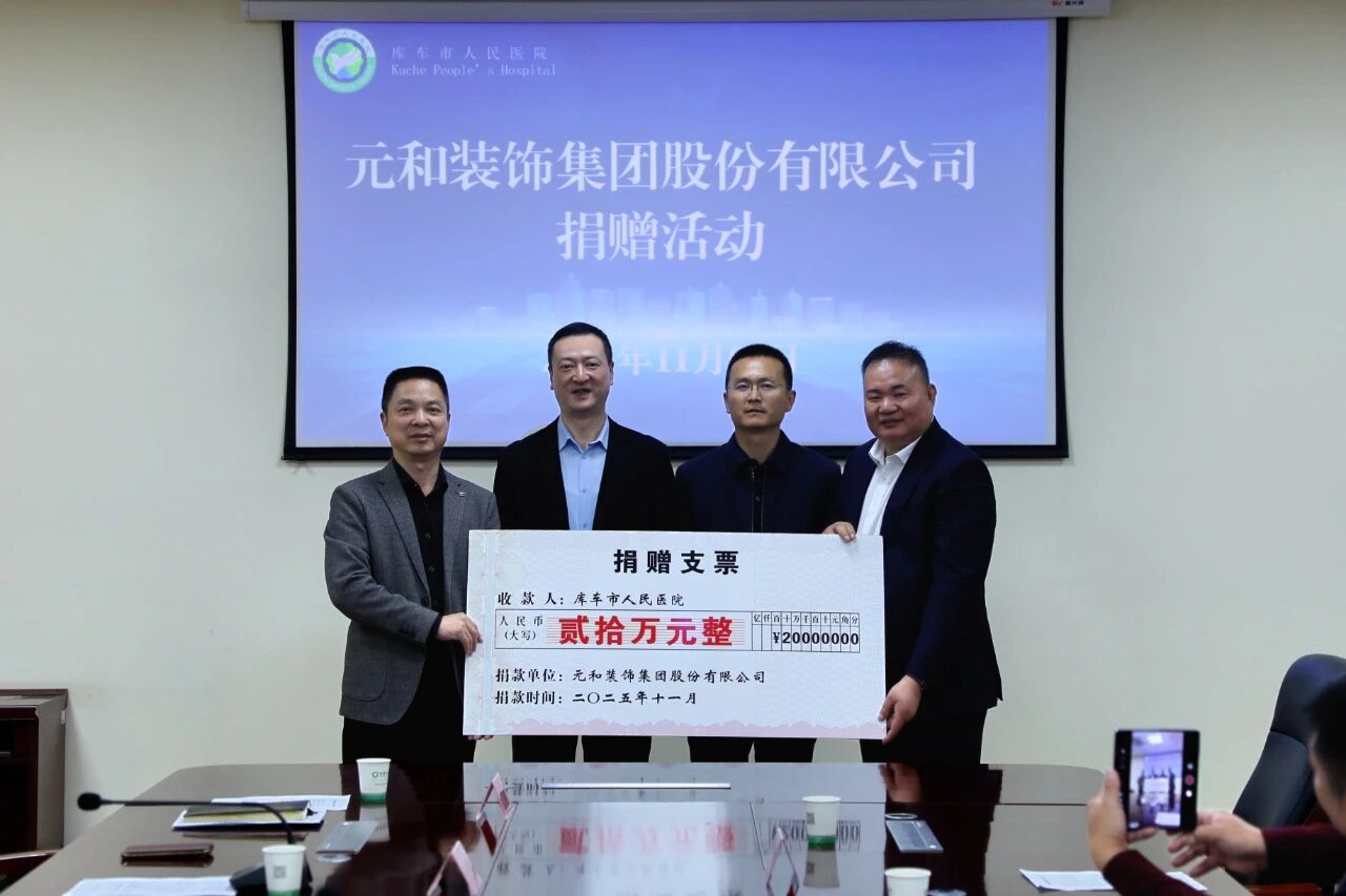 在杨勇指挥长和库车市人民医院党委书记徐永兴的共同见证下,章建平董事长代表元和装饰集团向库车市人民医院捐款20万元,专项用于困难群众免费诊疗基金,为当地医疗救助工作提供有力支持。