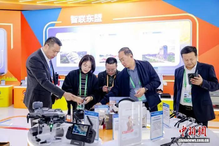 在广西综合形象馆智联东盟展区,迈越AI翻译眼镜吸引眼球,该产品可以通过镜片投影、语音交互、实时翻译等技术,将提词器、翻译机等功能集于一身。广西交科集团有限公司展示的“检E—智能多维道路检测车”,搭载自研“科宝”交通AI智能体,可以让公路养护实现从“慢贵靠经验”到“快准省智能”的转型升级。