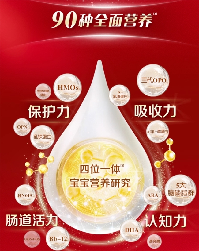防护与肠道方面,6重HMO、45mg/100g(3段)乳铁蛋白、活性蛋白OPN等协同,结合100倍活性益生菌与GOS益生元,构建三重守护;吸收上,OPO、小分子水解乳清蛋白等优化营养吸收效率。
