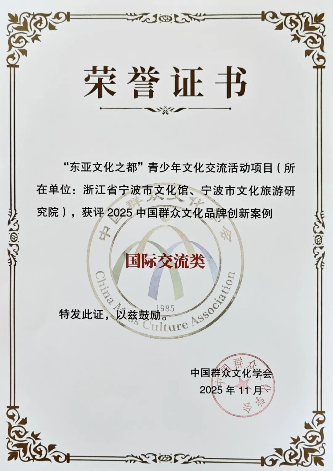 11月7日,由宁波市文化馆、宁波市文化旅游研究院联合申报的“东亚文化之都”青少年文化交流活动,成功入选2025中国群众文化品牌创新案例,成为国际交流类典型案例,彰显了我市在推动中外文化交流、促进青少年跨文化理解方面的卓越成效。