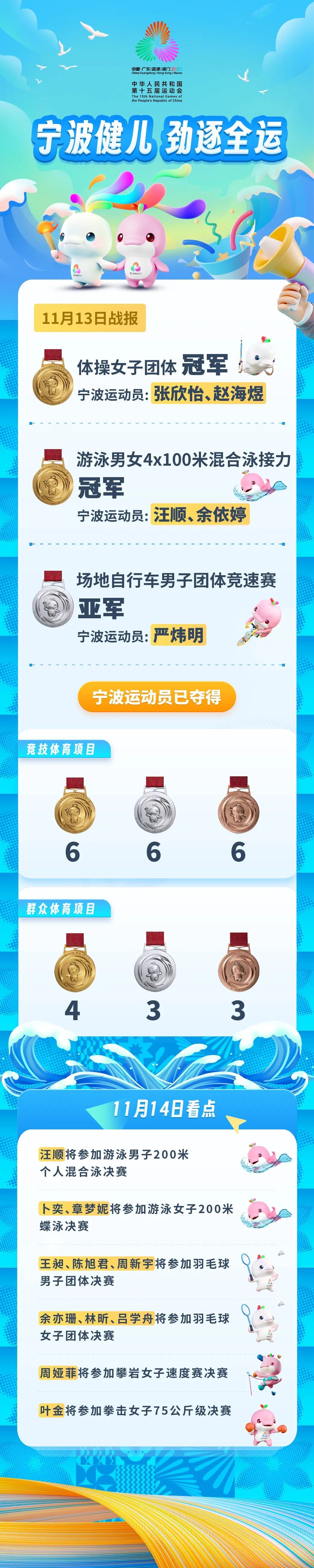 11月13日,第十五届全运会赛场上,宁波运动员再夺2金1银。