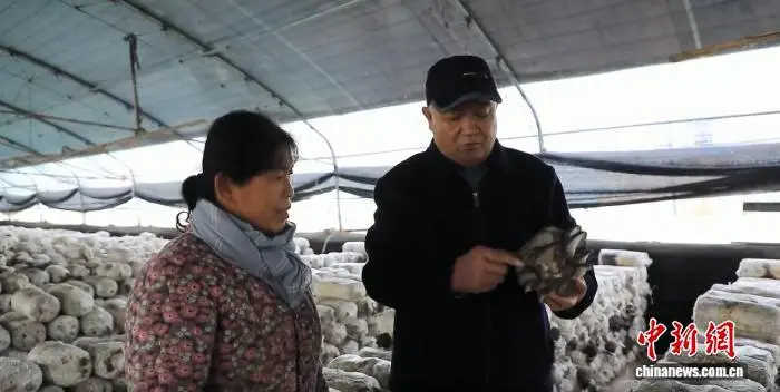 许万昌(右)在帮菇农解答种植难题。东昌府区委宣传部供图