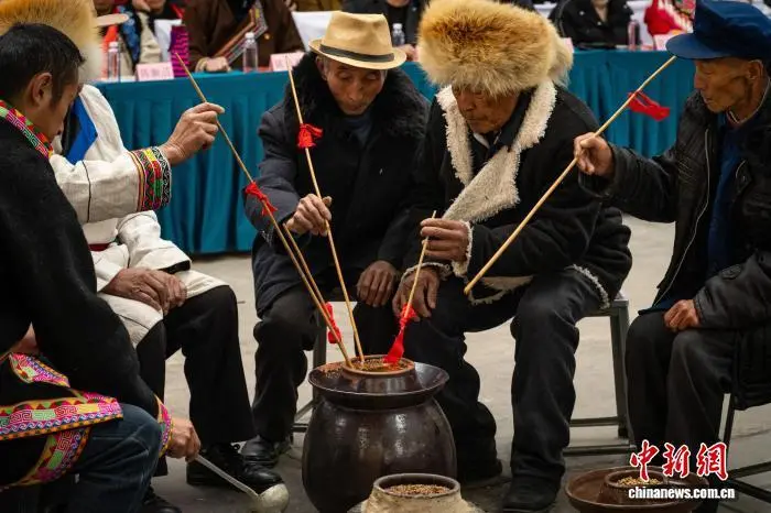 11月18日,第三届赤不苏“日麦喜”民俗文化活动在四川省阿坝州茂县赤不苏镇举行,当地羌族民众载歌载舞,喜迎即将到来的羌历新年。图为咂酒开坛仪式。韩金雨 摄