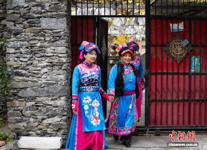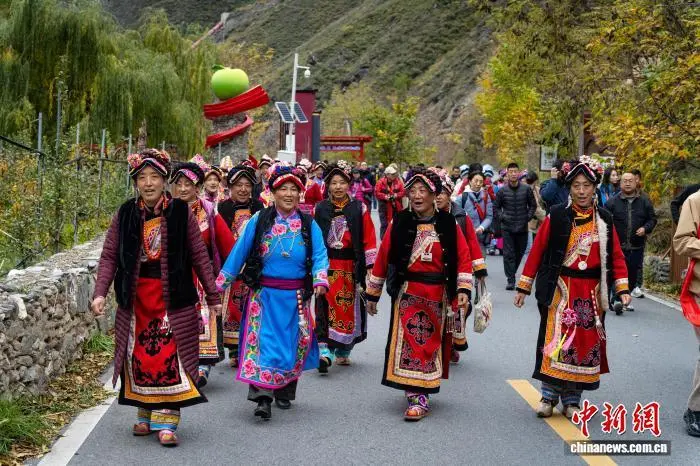 11月18日,第三届赤不苏“日麦喜”民俗文化活动在四川省阿坝州茂县赤不苏镇举行,当地羌族民众载歌载舞,喜迎即将到来的羌历新年。图为羌族民众身着民族服饰。韩金雨 摄