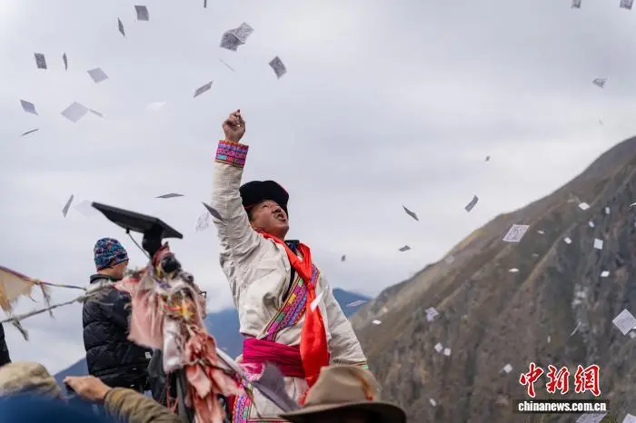 11月18日,第三届赤不苏“日麦喜”民俗文化活动在四川省阿坝州茂县赤不苏镇举行,当地羌族民众载歌载舞,喜迎即将到来的羌历新年。图为羌族民众抛洒“隆达”。韩金雨 摄