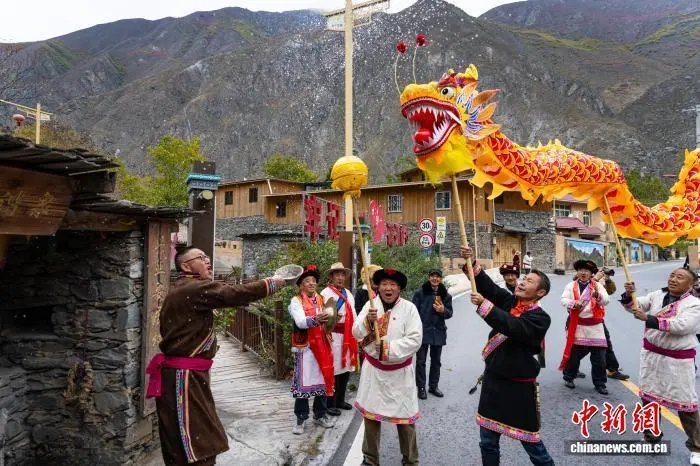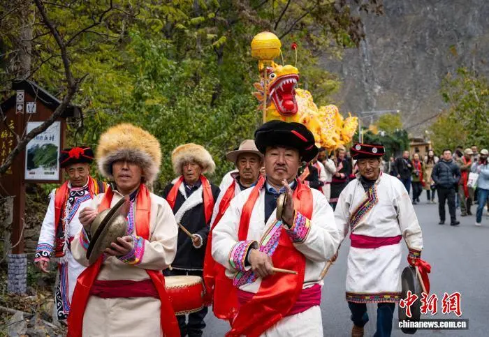 11月18日,第三届赤不苏“日麦喜”民俗文化活动在四川省阿坝州茂县赤不苏镇举行,当地羌族民众载歌载舞,喜迎即将到来的羌历新年。图为舞龙表演。韩金雨 摄
