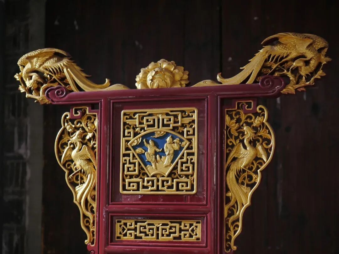 万工齐聚,尊荣立世。万工轿被誉为“天下第一轿”,耗时一万工时,需要八人抬行,由数百片可拆卸的花板组成,第三展区重点展示的就是万工轿的精美部件,每一寸木面都布满了精雕细琢的朱彩纹路。除此之外,还有桌椅、扛箱、脸盆架等大型家具,彰显出嫁人家的厚重家底。一轿十里,浩荡娶亲队伍中这些充满仪式感的朱金家具,不仅是结婚时的礼器,更是礼俗生活化、生活礼俗化的象征。