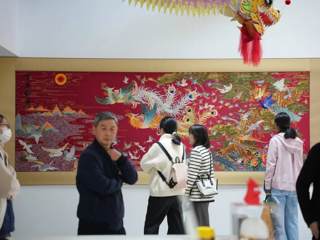 开幕式期间亮相的《百鸟和鸣图》,由6位技艺高超的老刺绣艺人花费千余工时、运用了近百种针法绣制完成,共绣制了128只鸟,涵盖了中国常见的鸟种。整幅作品富丽堂皇,展现了百鸟共舞和鸣的壮丽场景。