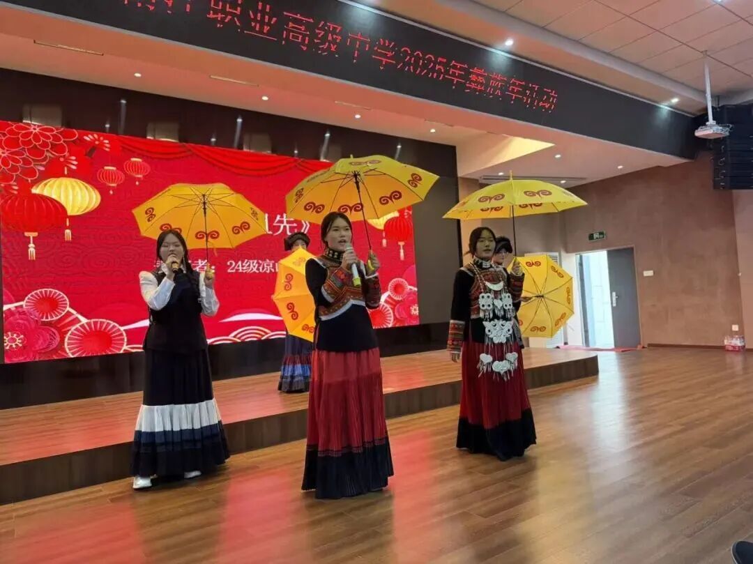 演出中,各班同学也纷纷登台送上祝福:24数媒班的周俊晨等同学用一首《天下》传递青春豪情;尊巴社带来的有氧操《Handclap》活力满满,让全场跟着节拍摇摆;23茶艺班和24工艺品设计班的同学合唱《暖暖》,温柔的旋律里满是对彝族伙伴的心意。
