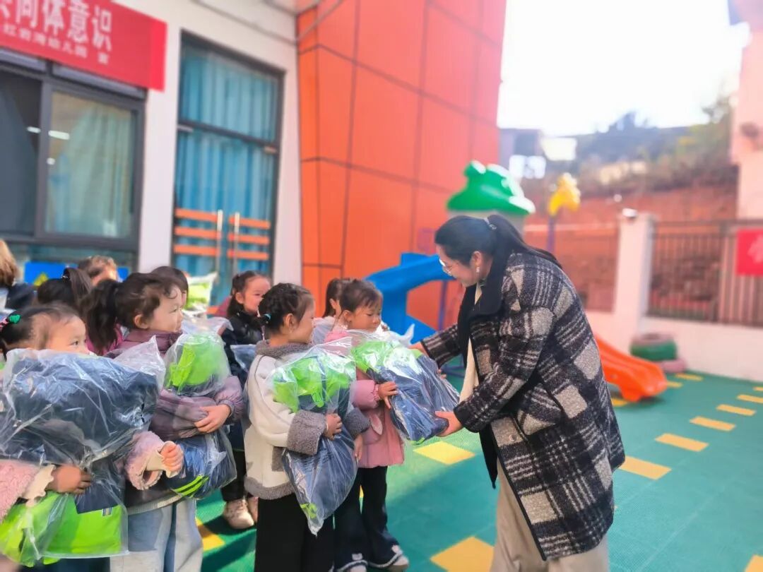 分发当天,孩子们早早就在场内有序地排队,眼中满是期待与喜悦。原宁波市奉化区第二实验幼儿园在甘帮扶支教的王璞莹园长以“爱心传递者”的身份,将手中的冬衣依次发放到每个孩子们手中。在分发过程中,王园长将来自浙江宁波市奉化区委办党员同志们的祝福传递给孩子们,让孩子感受到这份来自千里之外的细腻而富有温情的爱。现场,孩子将冬衣穿在身上,脸上洋溢着灿烂的笑容,稚嫩真诚的言语中,是对这份关爱的感恩,也藏着红幼小园滋养出的赤诚童心。