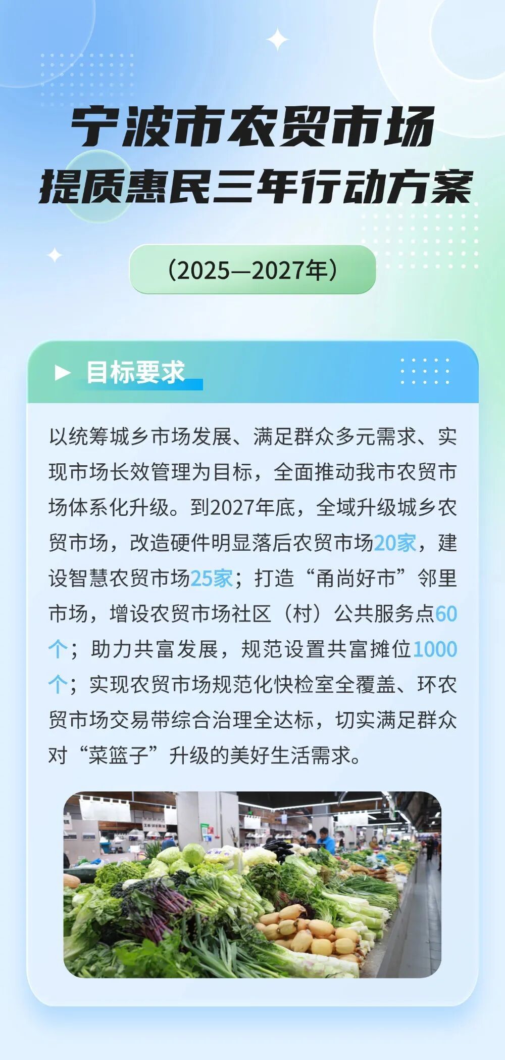 宁波市人民政府办公厅日前印发《宁波市农贸市场提质惠民三年行动方案(2025—2027年)》,旨在提升全市农贸市场建设管理水平,促进城乡融合发展,不断增强人民群众获得感。行动具体内容,一起来看↓