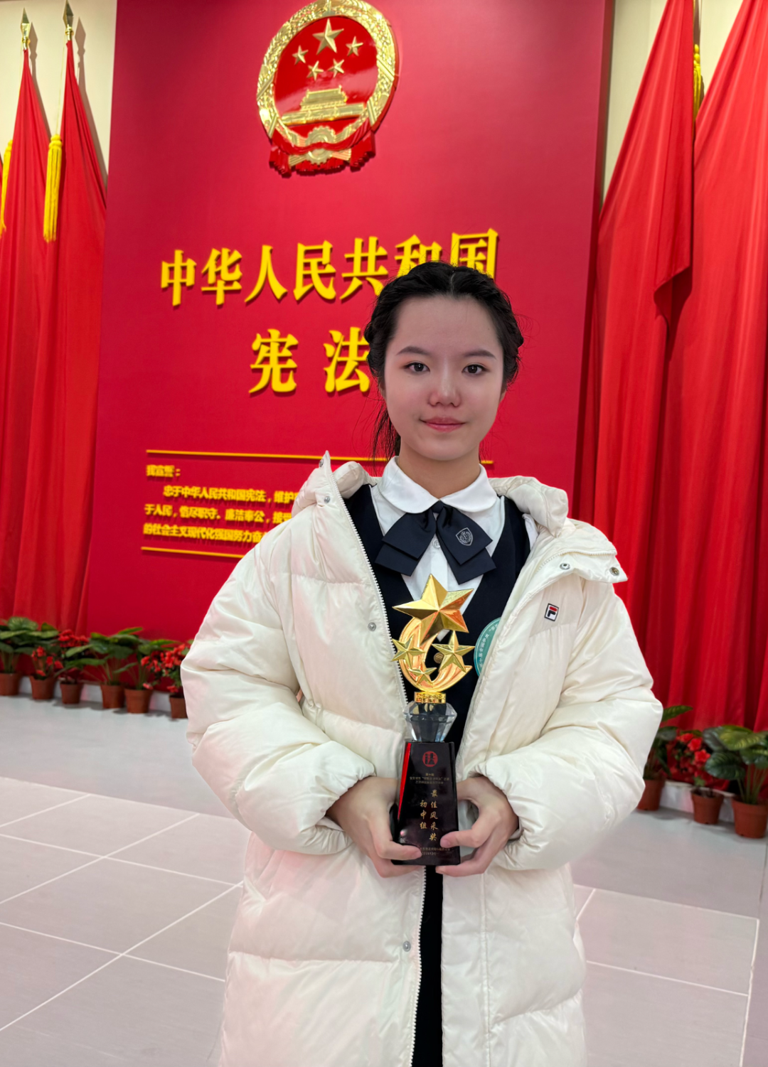 “站在全国赛场的领奖台上,我热血澎湃!这不仅是一份光荣,更是宪法和家乡文化带给我的底气与动力!”回忆起这场跨越近半年的追梦之旅,周语晗同学依旧难掩激动。从今年7月的余姚市赛、8月底的宁波市赛,再到10月的浙江省赛、12月的赴京国赛,她在宪法学习与演讲打磨中不断成长,而今年国赛即兴环节的赛制革新,更让这份成绩显得尤为可贵。
