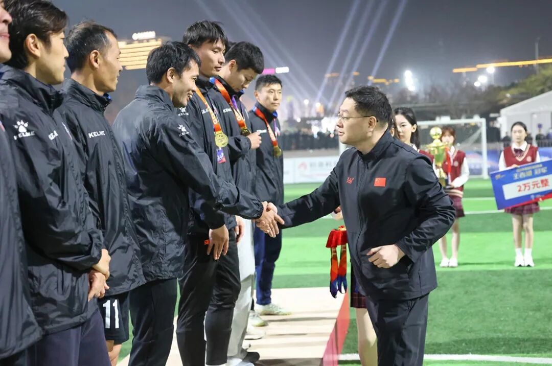 12月7日晚,2025年镇海区“镇超之夜”闭幕式在镇海西大河体育公园举行。经过激烈角逐,庄市队战胜澥浦队夺得本届“镇超”王者组冠军。区委书记林斌为王者组冠军球队颁奖,童华强、周方涛、陈齐权、杨承志、黄向华等区领导现场观摩。