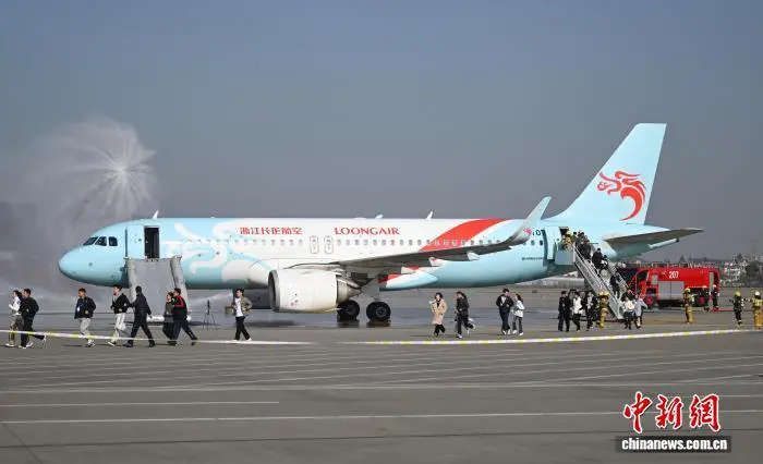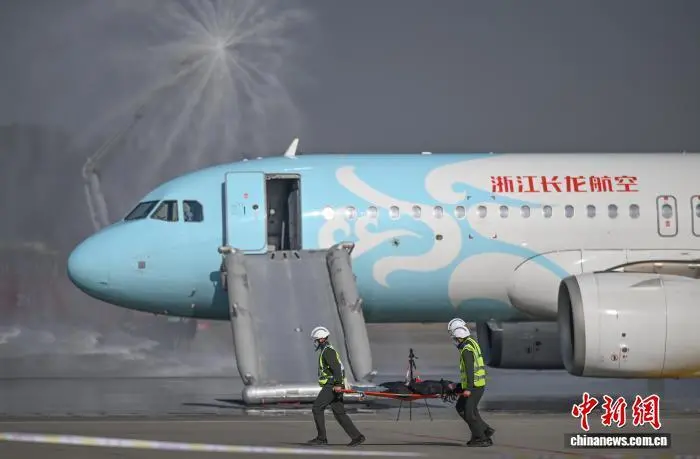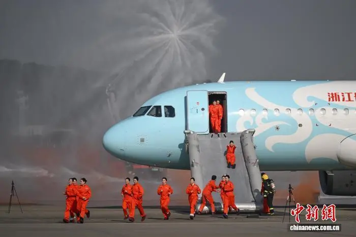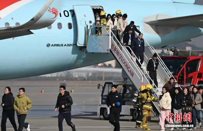 12月9日,参加演练人员有序离开飞机。当日,浙江杭州萧山国际机场举行“杭安·2025”航空器应急救援综合实战演练。本次演练模拟国际客运进港航班特情,设置航空器空中故障、人员救治与转运、无人机反干扰处置、残损航空器搬移等15项科目,通过跨部门实战化联动,全面检验机场及各救援单位的综合应急处置能力。中新社记者 王刚 摄