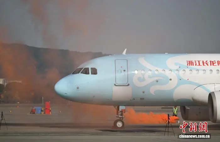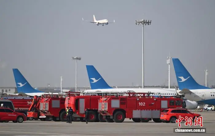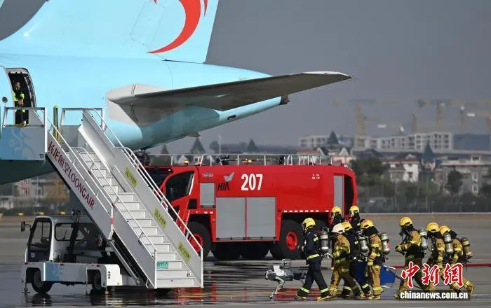 12月9日,一架飞机模拟落地后“起火”。当日,浙江杭州萧山国际机场举行“杭安·2025”航空器应急救援综合实战演练。本次演练模拟国际客运进港航班特情,设置航空器空中故障、人员救治与转运、无人机反干扰处置、残损航空器搬移等15项科目,通过跨部门实战化联动,全面检验机场及各救援单位的综合应急处置能力。中新社记者 王刚 摄