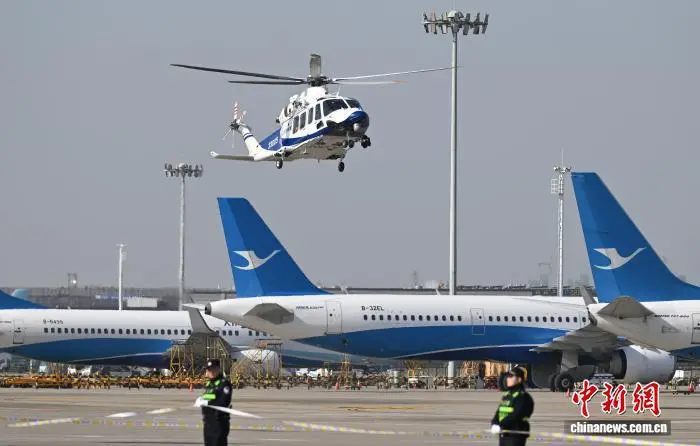 12月9日,AW139救援直升机在演练中紧急起飞转运“伤者”。当日,浙江杭州萧山国际机场举行“杭安·2025”航空器应急救援综合实战演练。本次演练模拟国际客运进港航班特情,设置航空器空中故障、人员救治与转运、无人机反干扰处置、残损航空器搬移等15项科目,通过跨部门实战化联动,全面检验机场及各救援单位的综合应急处置能力。中新社记者 王刚 摄