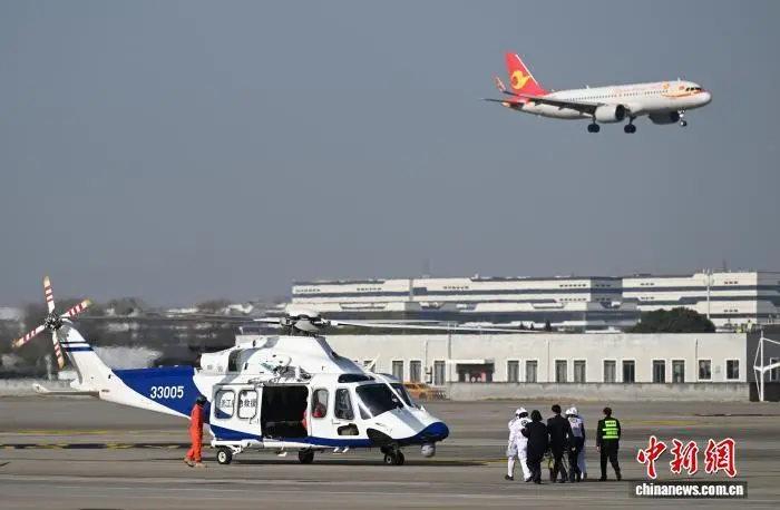 12月9日,参与演练的AW139救援直升机在停机坪附近转运“伤者”。当日,浙江杭州萧山国际机场举行“杭安·2025”航空器应急救援综合实战演练。本次演练模拟国际客运进港航班特情,设置航空器空中故障、人员救治与转运、无人机反干扰处置、残损航空器搬移等15项科目,通过跨部门实战化联动,全面检验机场及各救援单位的综合应急处置能力。中新社记者 王刚 摄