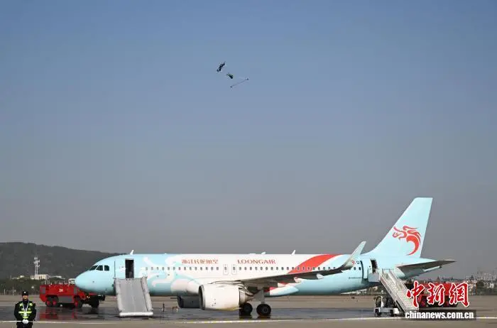 12月9日,参加演练人员通过逃生滑梯有序离开飞机。当日,浙江杭州萧山国际机场举行“杭安·2025”航空器应急救援综合实战演练。本次演练模拟国际客运进港航班特情,设置航空器空中故障、人员救治与转运、无人机反干扰处置、残损航空器搬移等15项科目,通过跨部门实战化联动,全面检验机场及各救援单位的综合应急处置能力。中新社记者 王刚 摄