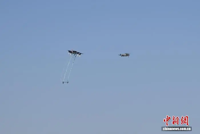 12月9日,演练现场机场公安警用无人机(左)反制“黑飞”无人机(右),目前杭州机场周边已布置无人机防御反制设备100余套。当日,浙江杭州萧山国际机场举行“杭安·2025”航空器应急救援综合实战演练。本次演练模拟国际客运进港航班特情,设置航空器空中故障、人员救治与转运、无人机反干扰处置、残损航空器搬移等15项科目,通过跨部门实战化联动,全面检验机场及各救援单位的综合应急处置能力。中新社记者 王刚 摄