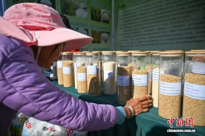 12月9日,2025云南·元谋第九届蔬菜种业博览会在云南省楚雄彝族自治州元谋县开幕,百余家知名种业、农资、农机、种植企业集中亮相。图为农户在展位前挑选稻种。中新社记者 刘冉阳 摄