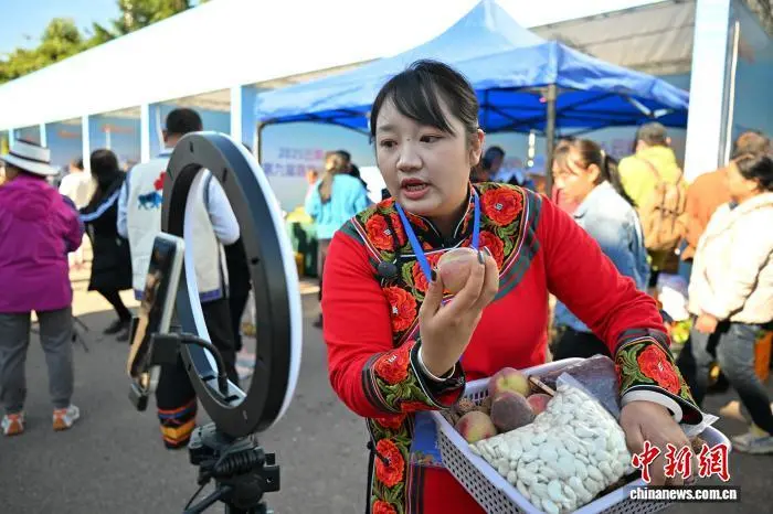 12月9日,2025云南·元谋第九届蔬菜种业博览会在云南省楚雄彝族自治州元谋县开幕,百余家知名种业、农资、农机、种植企业集中亮相。图为展商在现场直播介绍展品。中新社记者 刘冉阳 摄