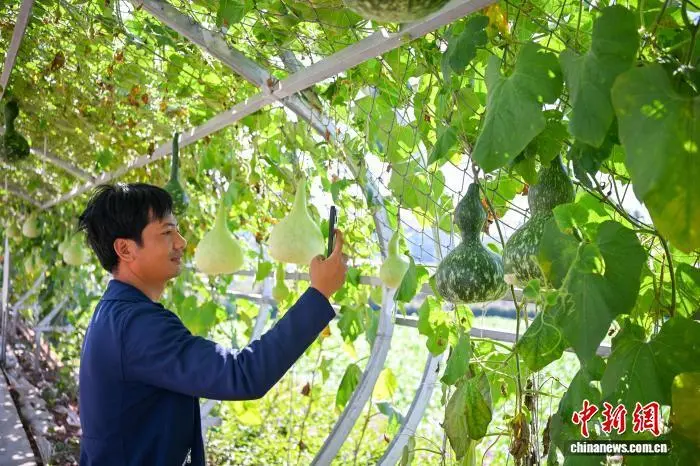 12月9日,2025云南·元谋第九届蔬菜种业博览会在云南省楚雄彝族自治州元谋县开幕,百余家知名种业、农资、农机、种植企业集中亮相。图为藤蔓上的葫芦吸引观众。中新社记者 刘冉阳 摄
