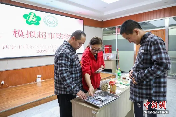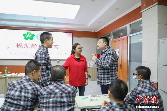 12月10日,青海省西宁市城东区“智爱共富工坊”内,心智障碍者通过超市购物模拟课学习生活技能。作为心智障碍群体的辅助就业基地,74名心智障碍者在工坊从事裁剪、缝纫等工作,所生产的产品通过认购、义卖等渠道推向市场。中新社记者 马铭言 摄