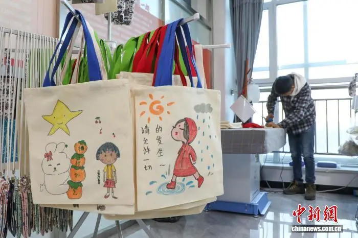12月10日,青海省西宁市城东区“智爱共富工坊”内展出的帆布包。作为心智障碍群体的辅助就业基地,74名心智障碍者在工坊从事裁剪、缝纫等工作,所生产的产品通过认购、义卖等渠道推向市场。中新社记者 马铭言 摄