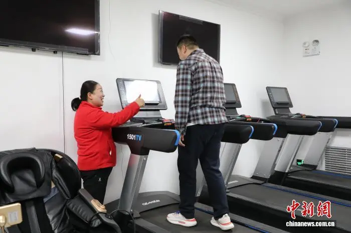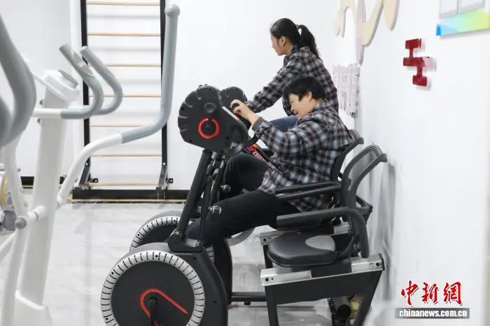 12月10日,青海省西宁市城东区“智爱共富工坊”内,老师(左一)辅导心智障碍者使用运动器械。作为心智障碍群体的辅助就业基地,74名心智障碍者在工坊从事裁剪、缝纫等工作,所生产的产品通过认购、义卖等渠道推向市场。中新社记者 马铭言 摄