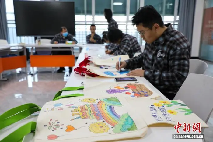 12月10日,青海省西宁市城东区“智爱共富工坊”内,心智障碍劳动者在帆布包上进行绘画。作为心智障碍群体的辅助就业基地,74名心智障碍者在工坊从事裁剪、缝纫等工作,所生产的产品通过认购、义卖等渠道推向市场。中新社记者 马铭言 摄