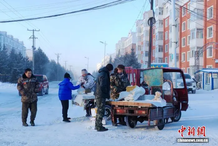 “中国最冷小镇”呼中最低温降至-39℃,商贩裹着厚厚的棉衣和帽子卖豆腐。 孙富国 摄
