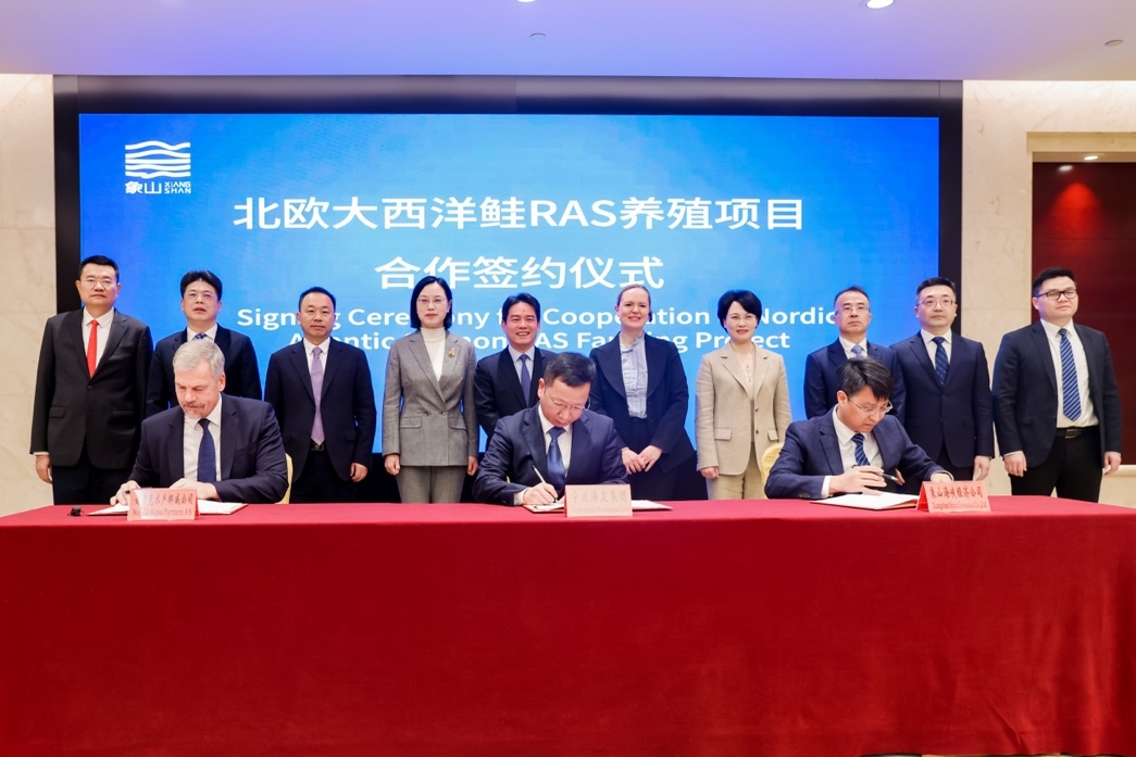 随后,在与会领导和嘉宾的共同见证下,挪威诺帝克水产公司、宁波市海洋发展集团有限公司、象山海峡经济技术合作有限公司签署合资合作协议;挪威诺帝克水产公司与银团签署授信合作协议,这标志着北欧大西洋鲑RAS养殖项目正式进入资本协同、金融支持、多方合作并行推进的新阶段。
