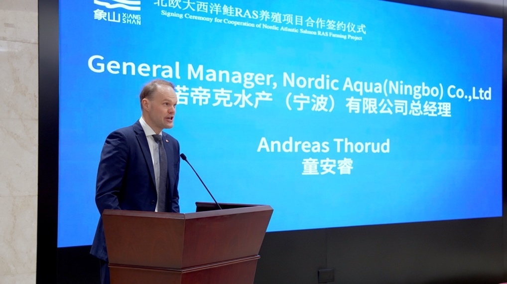 签约仪式上,诺帝克水产(宁波)有限公司总经理童安睿表示:“今年前10个月,中国进口的大西洋鲑已超过14万吨,增长近50%,这让我们看到了中国市场的巨大潜力。合资转型和银团融资的落地,为我们带来了更扎实的资金和本地支持,也让我们离中国消费者更近了一步。未来,我们会继续把挪威先进的循环水养殖技术和本地运营结合起来,为中国市场提供更新鲜、更安全、更可持续的大西洋鲑,同时也希望能推动中国水产养殖向更高效、更绿色的方向发展。”
