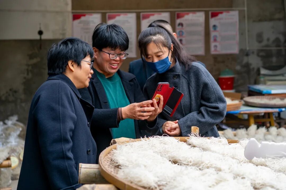 直播筹备阶段,联通直播助农团队的姑娘小伙扛起专业设备就提前深入夏樟村“踩点探营”,他们的身份不是简单的直播团队,而是“数字乡村建设官”。她们走进田间院落,拍摄乡村风光与红薯面古法制作的宣传素材,用镜头讲述百年手艺故事;同时发挥技术优势,为夏樟村定制产销一体化方案,指导优化产品包装、提炼卖点,还留下可持续的数字化销售方法,赋能村子自我 “造血”。