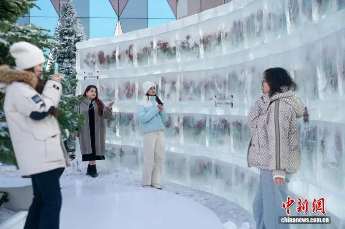 12月21日,黑龙江哈尔滨,游人打卡“冰封玫瑰”。近日,“冰封玫瑰”冰雪景观在哈尔滨哈西万达广场门前限定回归,吸引许多市民游客前来打卡。中新社记者 赵宇航 摄