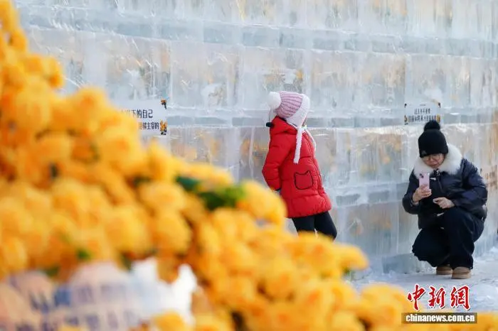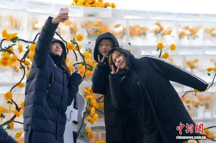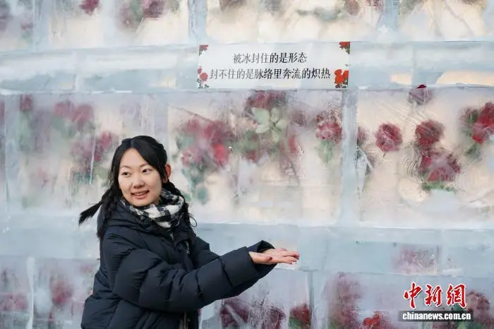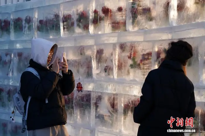 12月21日,黑龙江哈尔滨,游人打卡“冰封玫瑰”。中新社记者 赵宇航 摄
