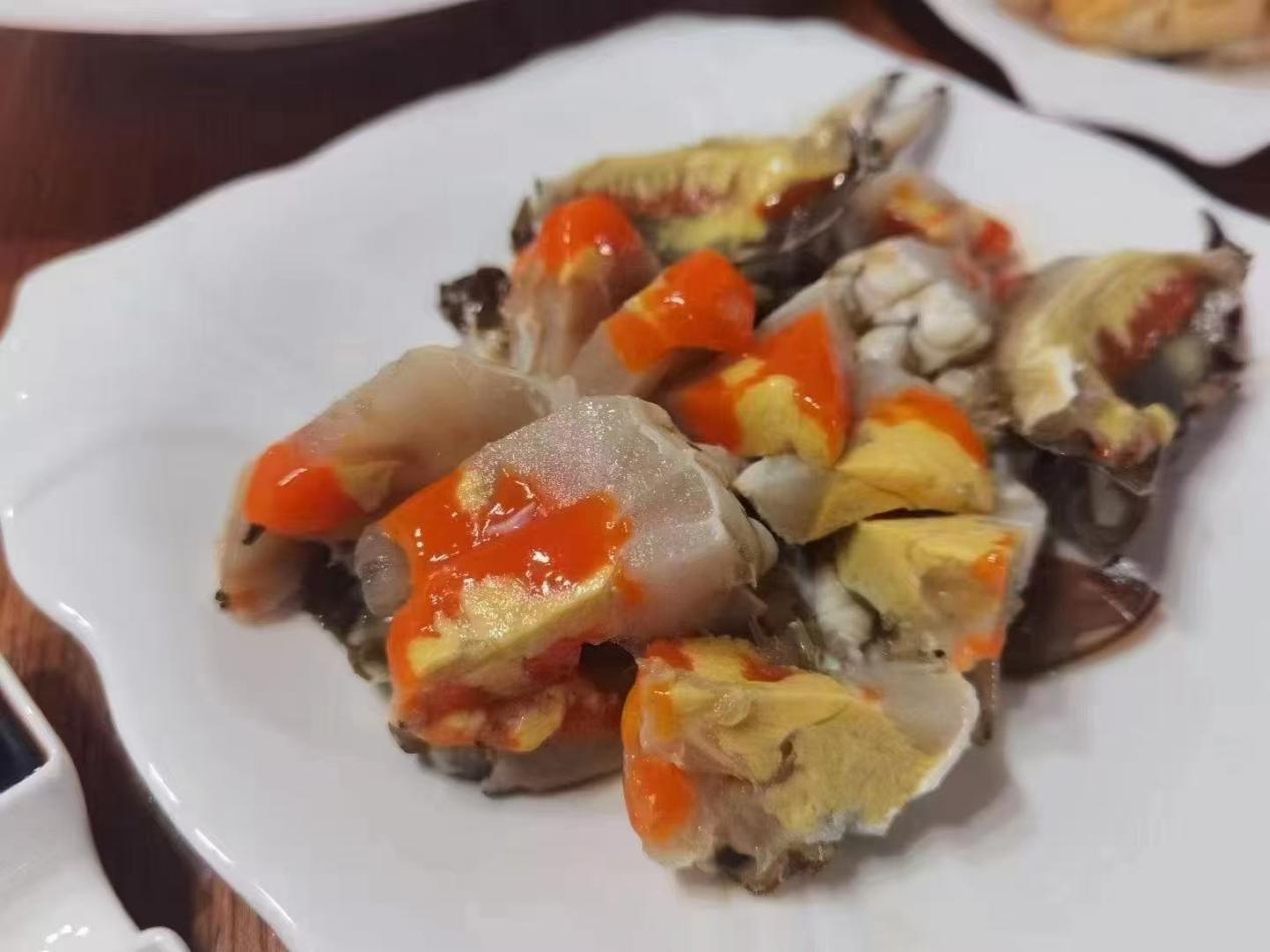 精选的梭子蟹,被精准的咸度与低温瞬间定格在最巅峰的状态——蟹肉晶莹如水晶,肌理分明,入口是冰淇淋般的沁凉与丝滑;而那艳若朝阳的红膏,醇厚、甘香、略带刺激的咸鲜,在舌尖奏响冰与火的交响。