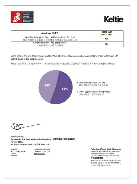 “以品质立基、用创新兴企”是理想卫浴自创立以来一直坚守的初心,经过30余载的创新与守正,理想卫浴及旗下蓝色卫浴累计专利高达1913项,在欧洲主要同行专利总量中占比52%,在“快速安装淋浴门”领域专利占比更是高达62%。在欧洲传统优势的淋浴房技术版图上,理想卫浴以压倒性优势占据半壁江山,牢牢掌握行业核心技术,让中国制造在全球技术舞台上拥有了不容置疑的话语权。