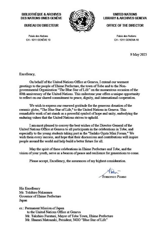 (图:联合国日内瓦总部特别致予本次活动的贺信)