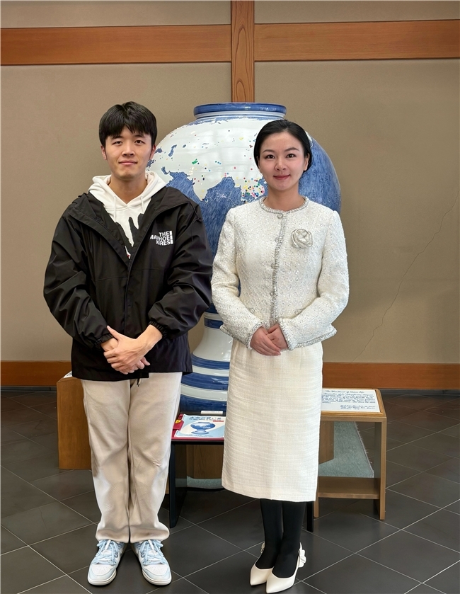 (图:“蓝色生命之星”委员会中国区主席胡丽芳和中国青年代表沈家成合影。右:委员会中国区主席胡丽芳,左:中国青年代表沈家成)