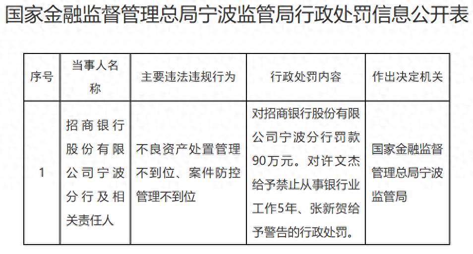 12月27日消息,国家金融监督管理总局宁波监管局日前披露的行政处罚信息公开表显示,因不良资产处置管理不到位、案件防控管理不到位,招商银行股份有限公司宁波分行被罚90万元。