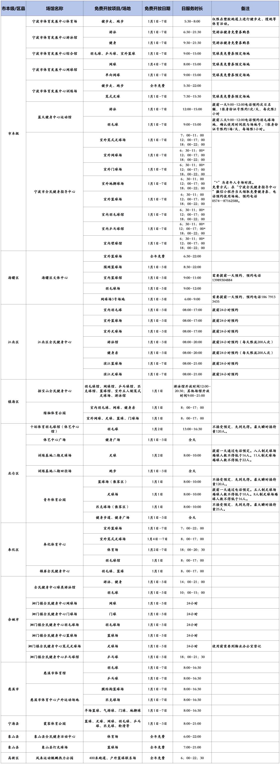 1月1日至7日是宁波市第五个全民健身周,为深入贯彻落实《浙江省公共体育设施管理办法》《宁波市全民健身条例》,满足市民健身需求,全民健身周期间全市这些场馆免费对外开放。