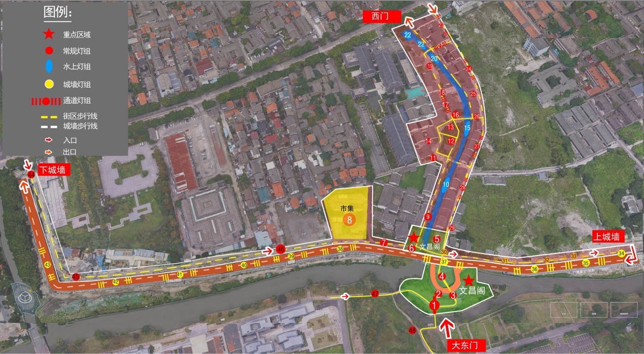 本次灯会首创“城墙灯会”模式,以骢马河—古城墙为载体,构建“一区一线一极点”游览体系。逾百组非遗彩灯沿城墙绵延铺展,夜晚配合光影科技呈现立体灯光秀,再现盛唐气象与江南意境。