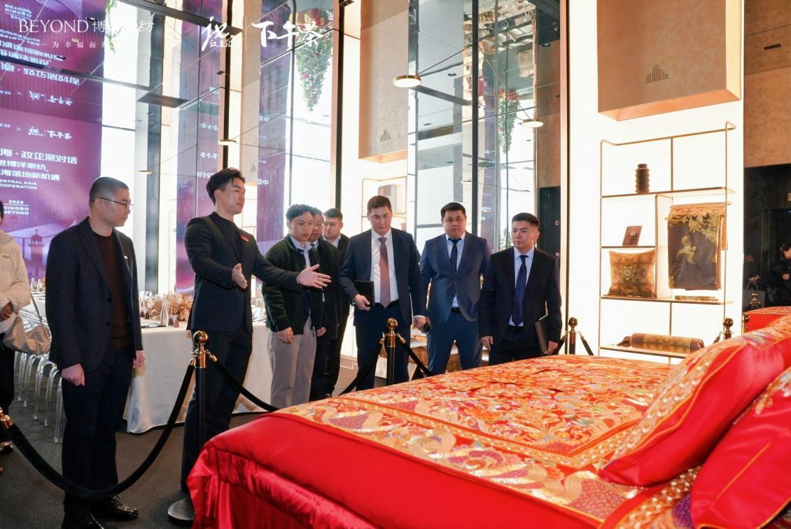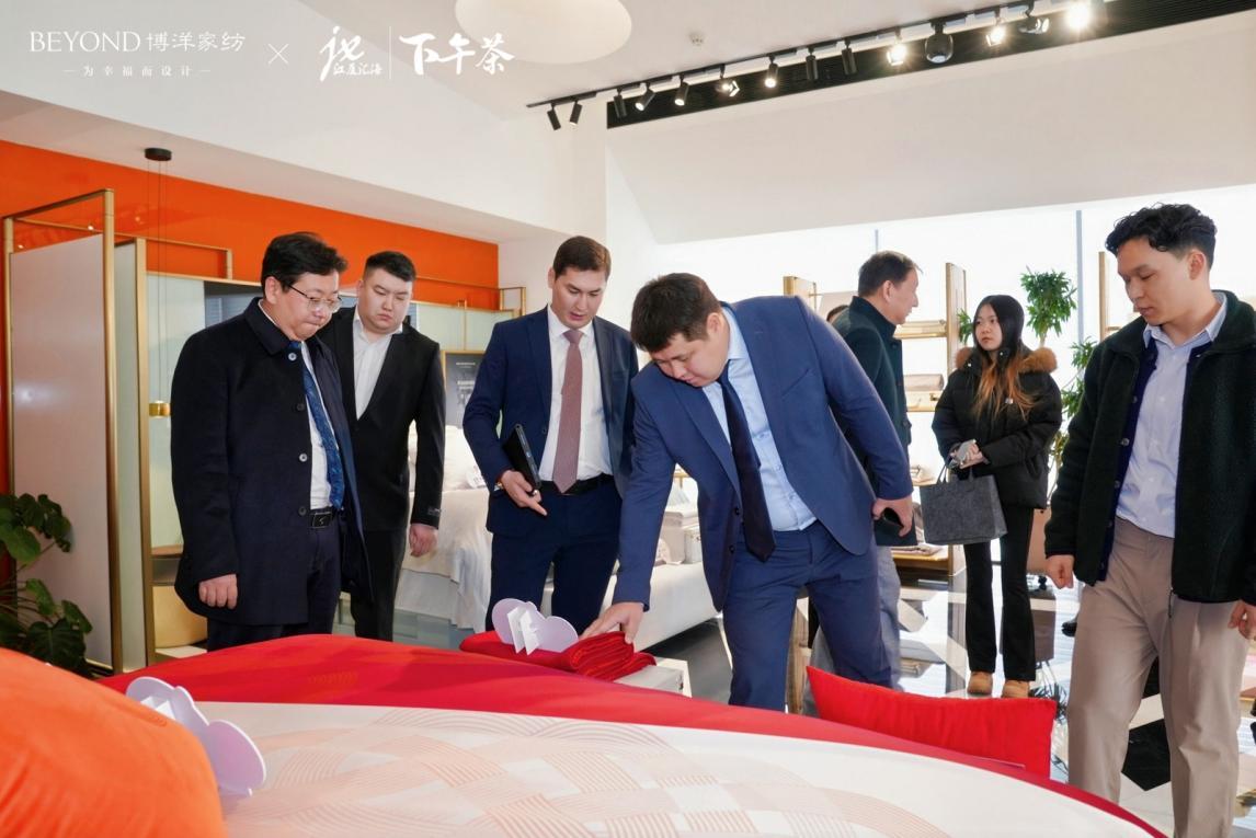 活动当日上午,博洋家纺团队与江厦智库企业出海服务团还带领阿拉木图州政府代表团,走进NFCC宁波时尚创意中心博洋家纺展厅,开启一场融合匠心工艺与文化传承的参访之旅。展厅分三层布局,功能分区清晰:一楼集中陈列核心藏品,传递品牌“幸福”的核心设计理念;二楼、三楼涵盖高端床品展销、互动体验场地及主题展区。现场展出的镇馆之宝“幸福花”、爱马仕联名床品、敦煌主题鹅绒被等高端系列,凭借珍稀材质、精湛工艺与定制化服务,充分彰显品牌创新实力。