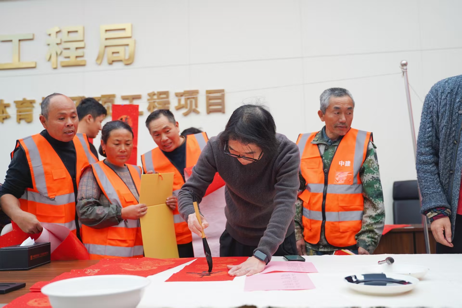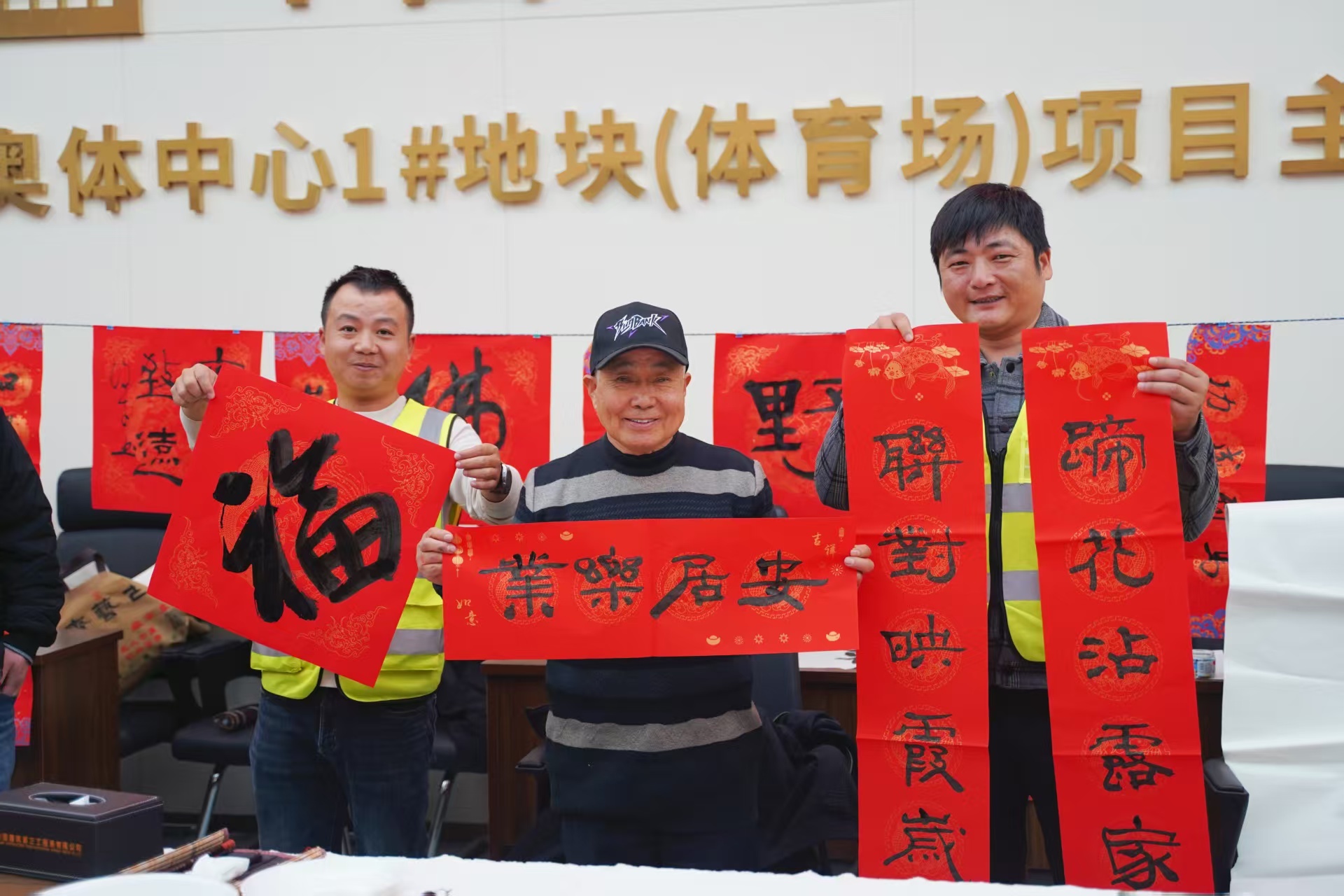 活动持续两个多小时,书法名家们共书写春联及“福”字300余副。火红的联纸、浓郁的墨香与建设者们朴实的笑脸相映成趣,为繁忙的工地增添了浓厚的喜庆祥和氛围,生动勾勒出新时代“艺术为人民、劳动铸辉煌”的鲜活图景。