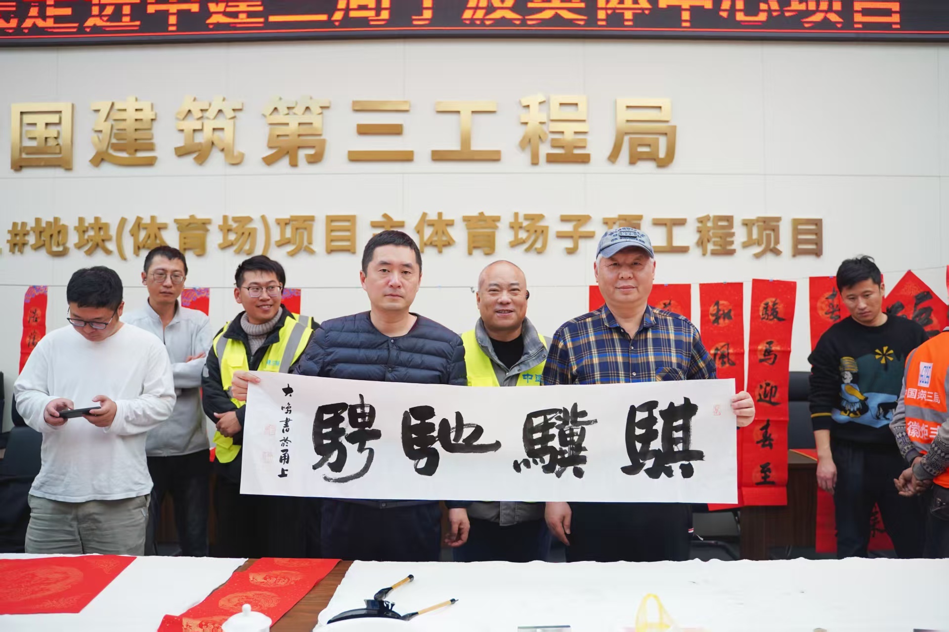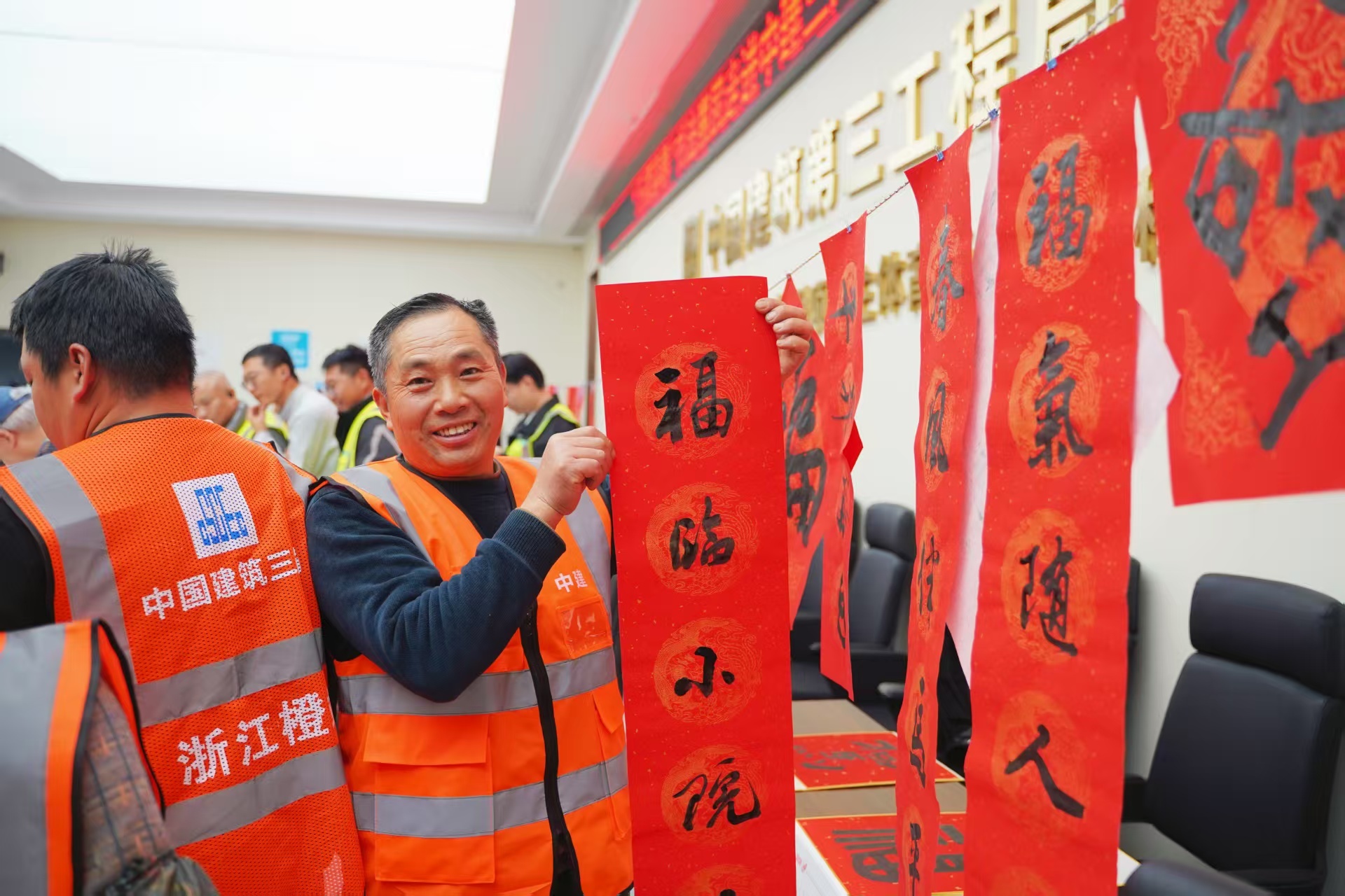 闻讯而来的建设者们围聚桌前,或静心欣赏书法艺术,或挑选心仪的春联内容,脸上洋溢着幸福的笑容。来自四川的钢筋工李师傅手捧刚领到的“骏马驰千里,春风暖万家”春联,喜悦之情溢于言表:“往年春联都是街上买的,今年是书法名家专门为我们写的,特别有意义、特别暖心!这字写得又好又精神,贴在宿舍门前,年味儿一下就浓了。”中建三局华东公司总经理助理、宁波奥体中心项目经理张晓冰也表示,此次活动不仅为工友们送上了新春祝福,更丰富了大家的文化生活,有效提升了项目团队的凝聚力与向心力。