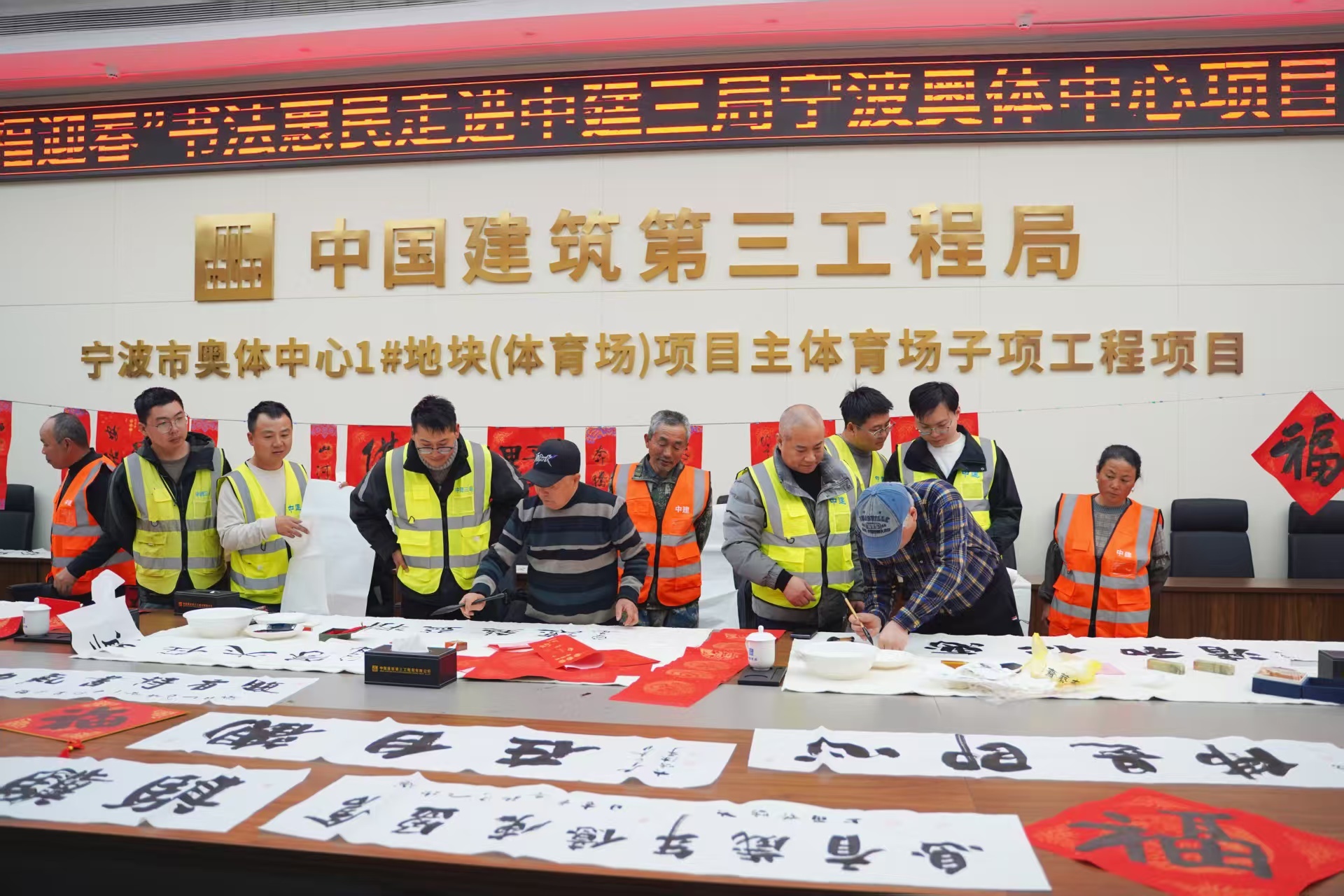 新春将至,年味渐浓。1月14日,中建三局宁波奥体中心项目工地内墨香四溢、暖意融融,一场主题鲜明的“万福迎春”书法惠民文化慰问活动在此火热开展。5位来自浙江省书法协会、宁波市书法协会、宁波书画院、宁波市美术家协会的知名书法家深入一线,挥毫泼墨为坚守岗位的建设者们书写春联与“福”字,将中华优秀传统文化的馨香与新春祝福送到劳动者心坎上。